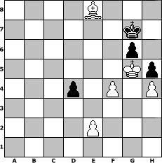 Partie-Notation im PGN-Format [Event "Chess960-2016-01"] [Site "www.mySchach.de"] [Date "2016.02.07"] [Round "1"] [White "Schachfedi"] [Black "Achimkogge"] [Variant "Fischerrandom"] [SetUp "1"] [FEN "nbrnbkqr/pppppppp/8/8/8/8/PPPPPPPP/NBRNBKQR w KQkq - 0 1"] [WhitemyELO "1729"] [BlackmyELO "1424"] [Result "1-0"] [TimeControl "10/2592000"] [WhiteDays "30"] [BlackDays "30"] [MySchachNr "102438"] 1. f4 f5 2. Ne3 Bg6 3. c4 c5 4. Bg3 Nb6 5. b3 e6 6. Qf2 Bd6 7. O-O Qf7 8. Nac2 Nc6 9. Rfd1 O-O 10. d4 cxd4 11. Nxd4 Nxd4 12. Rxd4 Bc5 13. Rd3 Qf6 14. Rcd1 Rfd8 15. Bh4 Qf8 16. Qf3 Be7 17. Bxe7 Qxe7 18. Qxb7 Ra8 19. c5 Qxc5 20. Kf2 Qc8 21. Qxc8 Raxc8 22. Nc4 Nxc4 23. bxc4 Rxc4 24. g3 d5 25. Rb3 h6 26. Rb7 a5 27. Bd3 Rb4 28. Rxb4 axb4 29. Rc1 h5 30. Rc7 Ra8 31. Rb7 Rxa2 32. Rxb4 Kh7 33. Rb6 Bf7 34. Rb7 Kg6 35. h4 Kf6 36. Ke3 Ra4 37. Kf3 d4 38. Rb6 Be8 39. Kf2 Bd7 40. Rd6 Ke7 41. Rb6 Kf6 42. Rd6 Ke7 43. Rxd7+ Kxd7 44. Bb5+ Kd6 45. Bxa4 e5 46. fxe5+ Kxe5 47. Kf3 g6 48. Be8 Kf6 49. Kf4 Kg7 50. Kg5 f4 51. gxf4 1-0 Stellungs-Notation im FEN-Format 4B3/6k1/6p1/6Kp/3p1P1P/8/4P3/8 - - - 0 51 Geschlagene Figuren Weiss: ![]() ![]() ![]() ![]() ![]() ![]() ![]() ![]() ![]() ![]() ![]() ![]() ![]() ![]() ![]() Geschlagene Figuren Schwarz: ![]() ![]() ![]() ![]() ![]() ![]() ![]() ![]() ![]() ![]() ![]() ![]() ![]() ![]() ![]() Klicken Sie auf eine geschlagene Figur um den gewünschten Zug darzustellen!