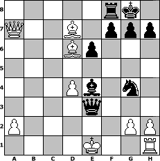 Partie-Notation im PGN-Format [Event "Auf dem Weg zu 1600 ELO"] [Site "www.mySchach.de"] [Date "2008.02.19"] [Round "1"] [White "Knight"] [Black "Seneca"] [ECO "D00"] [WhitemyELO "1090"] [BlackmyELO "1586"] [Result "0-1"] [TimeControl "10/864000"] [WhiteDays "23"] [BlackDays "18"] [MySchachNr "42728"] 1. d4 d5 2. e4 dxe4 3. Nc3 Bf5 4. f3 exf3 5. Qxf3 Bxc2 6. Qxb7 Nd7 7. Nd5 Rc8 8. Bf4 e6 9. Nxc7+ Rxc7 10. Bxc7 Be4 11. Qxa7 Qc8 12. Bb5 Bb4+ 13. Kf2 Ngf6 14. Ne2 O-O 15. Rac1 Bd2 16. Rc2 Bxc2 17. Nc3 Bxc3 18. bxc3 Be4 19. Bd6 Qxc3 20. Bxd7 Ng4+ 21. Kf1 Qd3+ 22. Ke1 Qe3+ 0-1 Stellungs-Notation im FEN-Format 5rk1/Q2B1ppp/3Bp3/8/3Pb1n1/4q3/P5PP/4K2R - - - 5 23 Geschlagene Figuren Weiss: Geschlagene Figuren Schwarz: Klicken Sie auf eine geschlagene Figur um den gewünschten Zug darzustellen!