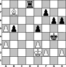 Partie-Notation im PGN-Format [Event "Kaissaturnier"] [Site "www.mySchach.de"] [Date "2005.07.30"] [Round "2"] [White "chessmike"] [Black "Chelly"] [ECO "A40"] [WhitemyELO "1971"] [BlackmyELO "1814"] [Result "1-0"] [TimeControl "10/1728000"] [WhiteDays "20"] [BlackDays "06"] [MySchachNr "15613"] 1. d4 e6 2. c4 d5 3. Nc3 Nf6 4. Bg5 Be7 5. e3 h6 6. Bh4 O-O 7. Nf3 Re8 8. Rc1 Nbd7 9. a3 a6 10. Bd3 dxc4 11. Bxc4 b5 12. Bd3 Bb7 13. b4 e5 14. Bxf6 Bxf6 15. Be4 c6 16. d5 cxd5 17. Nxd5 Bxd5 18. Qxd5 Nb6 19. Qxd8 Raxd8 20. Nd2 Re7 21. Rc6 Red7 22. Rxb6 Rxd2 23. O-O R2d6 24. Rxd6 Rxd6 25. Rc1 g6 26. Kf1 Kg7 27. Ke2 Bd8 28. g4 Kf6 29. Rc8 Kg5 30. Ra8 Kxg4 31. Bb7 a5 32. Rxd8 Rxd8 33. bxa5 1-0 Stellungs-Notation im FEN-Format 3r4/1B3p2/6pp/Pp2p3/6k1/P3P3/4KP1P/8 - - - 0 33 Geschlagene Figuren Weiss: ![]() ![]() ![]() ![]() ![]() ![]() ![]() ![]() ![]() ![]() ![]() ![]() ![]() ![]() ![]() Geschlagene Figuren Schwarz: ![]() ![]() ![]() ![]() ![]() ![]() ![]() ![]() ![]() ![]() ![]() ![]() ![]() ![]() ![]() Klicken Sie auf eine geschlagene Figur um den gewünschten Zug darzustellen!