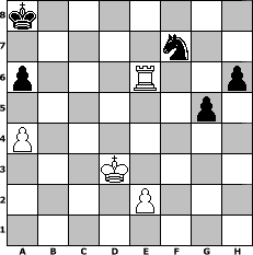 Partie-Notation im PGN-Format [Event "Sommerevent"] [Site "www.mySchach.de"] [Date "2018.07.12"] [Round "1"] [White "Andylein1989"] [Black "sprinterde"] [ECO "C62"] [WhitemyELO "1679"] [BlackmyELO "1744"] [Result "1-0"] [TimeControl "10/1728000"] [WhiteDays "20"] [BlackDays "19"] [MySchachNr "112630"] 1. e4 e5 2. Nf3 Nc6 3. Bb5 d6 4. c3 Bd7 5. d3 a6 6. Ba4 b5 7. Bc2 Bg4 8. Nbd2 h6 9. Nf1 Qf6 10. N1d2 O-O-O 11. h3 Be6 12. a4 g5 13. Bb3 b4 14. Nc4 d5 15. exd5 Bxd5 16. Be3 e4 17. Bd4 Nxd4 18. Nxd4 exd3 19. Qxd3 Bxg2 20. Rh2 Re8+ 21. Kd1 Be4 22. Qg3 Bc5 23. f3 bxc3 24. bxc3 Bxd4 25. fxe4 Bxc3 26. Rc1 Qd4+ 27. Kc2 Bb4 28. Kb1 Qxe4+ 29. Ka2 Kb8 30. Rhc2 Nf6 31. Nd2 Qe5 32. Qxe5 Rxe5 33. Nf3 Re3 34. Nd4 Bd6 35. Nf5 Rxh3 36. Nxd6 cxd6 37. Rb2 Ka7 38. Rc7+ Ka8 39. Rc6 Rxb3 40. Rxb3 Ka7 41. Rxd6 Ne4 42. Rd7+ Ka8 43. Rxf7 Rd8 44. Rb6 Rd2+ 45. Kb3 Rd3+ 46. Kc4 Nd6+ 47. Kxd3 Nxf7 48. Re6 1-0 Stellungs-Notation im FEN-Format k7/5n2/p3R2p/6p1/P7/3K4/4P3/8 - - - 1 48 Geschlagene Figuren Weiss: Geschlagene Figuren Schwarz: Klicken Sie auf eine geschlagene Figur um den gewünschten Zug darzustellen!