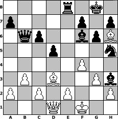 Partie-Notation im PGN-Format [Event "Der sizillianische Drachen"] [Site "www.mySchach.de"] [Date "2004.06.23"] [Round "2"] [White "Master1"] [Black "kalle"] [ECO "B70"] [WhitemyELO "1178"] [BlackmyELO "1660"] [Result "0-1"] [TimeControl "10/3456000"] [WhiteDays "116"] [BlackDays "114"] [MySchachNr "5351"] 1. e4 c5 2. Nf3 d6 3. d4 cxd4 4. Nxd4 Nf6 5. Nc3 g6 6. Bd3 Bg7 7. O-O Nc6 8. Bb5 Bd7 9. Nxc6 bxc6 10. Bc4 O-O 11. Re1 Qc7 12. Bf4 Rfb8 13. b3 Rd8 14. e5 d5 15. Bd3 Nh5 16. Bc1 Bxe5 17. g3 Bxc3 18. Rxe7 Bxa1 19. Bh6 Bf6 20. Re3 Re8 21. Rxe8+ Rxe8 22. f4 Qb6+ 23. Kf1 Bh3# 0-1 Stellungs-Notation im FEN-Format 4r1k1/p4p1p/1qp2bpB/3p3n/5P2/1P1B2Pb/P1P1P2P/3Q1K2 - - - 3 24 Geschlagene Figuren Weiss: Geschlagene Figuren Schwarz: Klicken Sie auf eine geschlagene Figur um den gewünschten Zug darzustellen!