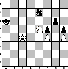 Partie-Notation im PGN-Format [Event "Turnier in den M"] [Site "www.mySchach.de"] [Date "2014.02.19"] [Round "1"] [White "lotchi"] [Black "Achimkogge"] [ECO "A06"] [WhitemyELO "1284"] [BlackmyELO "1436"] [Result "1/2-1/2"] [TimeControl "10/2592000"] [WhiteDays "30"] [BlackDays "27"] [MySchachNr "93083"] 1. Nf3 d5 2. d4 b5 3. e3 Bg4 4. Be2 e6 5. Bxb5+ c6 6. Be2 Nf6 7. Nc3 Bb4 8. Bd2 O-O 9. a3 Bd6 10. h3 Bxf3 11. Bxf3 Nbd7 12. g3 Nb6 13. b3 a5 14. a4 Bb4 15. O-O Qd7 16. g4 h6 17. e4 dxe4 18. Bxe4 Nxe4 19. Nxe4 Qxd4 20. Bxb4 Qxd1 21. Raxd1 axb4 22. c4 Rfd8 23. Rxd8+ Rxd8 24. Kg2 f5 25. gxf5 exf5 26. Ng3 g6 27. Re1 h5 28. h4 Kg7 29. Re7+ Kh6 30. Re6 Rc8 31. c5 Nd7 32. Rd6 Nxc5 33. a5 Nxb3 34. a6 Na5 35. Rd4 c5 36. Rd6 Rc6 37. Rxc6 Nxc6 38. Ne2 Na7 39. f4 Nb5 40. Kf2 b3 41. Nc3 Na7 42. Ke2 c4 43. Kd2 Kg7 44. Ke3 Nc6 45. Kd2 Kf7 46. Ke3 Ke6 47. Kd2 Kd7 48. Na4 Kc7 49. Kc3 b2 50. Nxb2 Kb6 51. Kxc4 Ne7 52. Nd3 Kxa6 53. Ne5 1/2-1/2 Stellungs-Notation im FEN-Format 8/4n3/k5p1/4Np1p/2K2P1P/8/8/8 - - - 1 53 Geschlagene Figuren Weiss: Geschlagene Figuren Schwarz: Klicken Sie auf eine geschlagene Figur um den gewünschten Zug darzustellen!