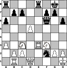 Partie-Notation im PGN-Format [Event "Blitz-"] [Site "www.mySchach.de"] [Date "2009.01.18"] [Round "1"] [White "Ostseeboy"] [Black "Knight"] [ECO "A02"] [WhitemyELO "1312"] [BlackmyELO "1086"] [Result "0-1"] [TimeControl "10/2592000"] [WhiteDays "90"] [BlackDays "87"] [MySchachNr "51757"] 1. f4 e5 2. fxe5 d6 3. exd6 Bxd6 4. Nf3 Nh6 5. d4 Nf5 6. e3 Nc6 7. Bb5 Bd7 8. O-O O-O 9. d5 Nb8 10. Bxd7 Nxd7 11. Nc3 Re8 12. Re1 Bc5 13. a3 Nxe3 14. Bxe3 Bxe3+ 15. Kh1 Nc5 16. Nb5 a6 17. Nc3 Qf6 18. Re2 h6 19. Rb1 Ne4 20. Rxe3 Nf2+ 0-1 Stellungs-Notation im FEN-Format r3r1k1/1pp2pp1/p4q1p/3P4/8/P1N1RN2/1PP2nPP/1R1Q3K - - - 1 21 Geschlagene Figuren Weiss: Geschlagene Figuren Schwarz: Klicken Sie auf eine geschlagene Figur um den gewünschten Zug darzustellen!