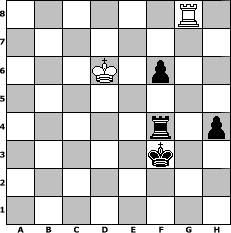Partie-Notation im PGN-Format [Event "Entdeckung der Langsamkeit"] [Site "www.mySchach.de"] [Date "2009.08.15"] [Round "1"] [White "bane"] [Black "Nowak"] [ECO "A22"] [WhitemyELO "1802"] [BlackmyELO "1734"] [Result "0-1"] [TimeControl "10/3456000"] [WhiteDays "317"] [BlackDays "318"] [MySchachNr "58351"] 1. c4 e5 2. Nc3 Nf6 3. e4 Bc5 4. Nf3 Ng4 5. d4 exd4 6. Na4 Bb4+ 7. Bd2 Qe7 8. Be2 Nc6 9. O-O Nge5 10. Nxe5 Qxe5 11. Bxb4 Nxb4 12. Qd2 Nc6 13. f4 Qe7 14. Bf3 b6 15. e5 Bb7 16. b4 a6 17. c5 b5 18. Nb2 O-O 19. Nd3 h6 20. a3 Ra7 21. a4 bxa4 22. Rxa4 Rb8 23. Rfa1 Raa8 24. Bd5 Kh8 25. Qe1 Re8 26. Qe4 Qh4 27. R4a3 Rab8 28. Bxc6 Bxc6 29. Qxd4 Qg4 30. R3a2 Kh7 31. Rd2 Ra8 32. Rf2 Qf5 33. Rd2 Re6 34. h3 h5 35. Kh2 Kg8 36. g3 Ree8 37. Ne1 f6 38. Nd3 Re6 39. exf6 gxf6 40. Nf2 Kg7 41. Ra3 Re1 42. Re3 Re8 43. Rxe8 Rxe8 44. Qc3 Re7 45. Qd4 Re1 46. Rd1 Re2 47. Rd2 Qe6 48. Qd3 Re1 49. Rb2 Re3 50. Qd4 Rf3 51. Qd2 Ra3 52. h4 Ra1 53. Qe2 Qxe2 54. Rxe2 Rb1 55. Ra2 Bb5 56. Ra3 Rxb4 57. Kg2 Rc4 58. Nd3 Kg6 59. Kf2 Kf5 60. Kf3 c6 61. Ke3 a5 62. Kf3 Rc2 63. Ke3 Bxd3 64. Rxd3 Rxc5 65. Rxd7 a4 66. Ra7 Rc3+ 67. Kd4 Rxg3 68. Rxa4 Rf3 69. Ra6 c5+ 70. Kxc5 Rxf4 71. Kd6 Kg4 72. Ra1 Kxh4 73. Rg1 Kh3 74. Rh1+ Kg4 75. Rg1+ Kf3 76. Rg8 h4 0-1 Stellungs-Notation im FEN-Format 6R1/8/3K1p2/8/5r1p/5k2/8/8 - - - 0 77 Geschlagene Figuren Weiss: Geschlagene Figuren Schwarz: Klicken Sie auf eine geschlagene Figur um den gewünschten Zug darzustellen!