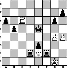 Partie-Notation im PGN-Format [Event "Advents-Turnier"] [Site "www.mySchach.de"] [Date "2010.11.28"] [Round "1"] [White "BobbyF4"] [Black "beowulf"] [ECO "B20"] [WhitemyELO "1521"] [BlackmyELO "1386"] [Result "0-1"] [TimeControl "10/864000"] [WhiteDays "00"] [BlackDays "03"] [MySchachNr "70165"] 1. e4 c5 2. d4 cxd4 3. c3 dxc3 4. Nxc3 Nc6 5. Bc4 e6 6. Nf3 Bb4 7. O-O Nge7 8. Bf4 Bxc3 9. bxc3 d5 10. exd5 Nxd5 11. Be5 Nxe5 12. Nxe5 Nxc3 13. Qc2 Nd5 14. Rad1 O-O 15. Rd4 Qb6 16. Rfd1 Nb4 17. Qe4 Nc6 18. Nxc6 Qxc6 19. Qd3 g6 20. Bb5 Qc7 21. f4 e5 22. fxe5 Qxe5 23. Rd5 Qc7 24. h3 Be6 25. Rd4 Bxa2 26. Rd7 Qc8 27. Qd4 a6 28. Be2 Be6 29. Rd6 Qc2 30. Rxe6 fxe6 31. Bc4 Rae8 32. Rd2 Qf5 33. Qd6 Rf6 34. Qd7 Qc5+ 35. Rd4 Qe7 36. Qxe7 Rxe7 37. Rd8+ Kg7 38. Rd2 b5 39. Be2 e5 40. Rb2 e4 41. g3 e3 42. g4 Rf2 43. Rc2 Rd7 44. h4 Rd2 45. Rc7+ Kf6 46. Rc6+ Ke5 0-1 Stellungs-Notation im FEN-Format 8/7p/p1R3p1/1p2k3/6PP/4p3/3rBr2/6K1 - - - 5 47 Geschlagene Figuren Weiss: Geschlagene Figuren Schwarz: Klicken Sie auf eine geschlagene Figur um den gewünschten Zug darzustellen!