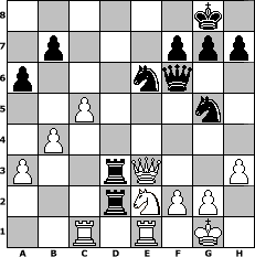 Partie-Notation im PGN-Format [Event "STHLM"] [Site "www.mySchach.de"] [Date "2010.03.25"] [Round "1"] [White "lasker"] [Black "neve"] [ECO "E30"] [WhitemyELO "1408"] [BlackmyELO "1380"] [Result "0-1"] [TimeControl "10/1728000"] [WhiteDays "51"] [BlackDays "60"] [MySchachNr "64285"] 1. d4 Nf6 2. c4 e6 3. Nc3 Bb4 4. Bg5 d5 5. cxd5 exd5 6. e3 c5 7. dxc5 Qa5 8. Nge2 Ne4 9. Rc1 Nxg5 10. a3 Bxc3+ 11. Nxc3 Be6 12. Bb5+ Nc6 13. O-O a6 14. Ba4 O-O 15. b4 Qd8 16. Bb3 d4 17. exd4 Bxb3 18. Qxb3 Nxd4 19. Qd1 Re8 20. h3 Qf6 21. Re1 Red8 22. Qa4 Nde6 23. Qb3 Rd2 24. Ne2 Rad8 25. Qe3 R8d3 0-1 Stellungs-Notation im FEN-Format 6k1/1p3ppp/p3nq2/2P3n1/1P6/P2rQ2P/3rNPP1/2R1R1K1 - - - 11 26 Geschlagene Figuren Weiss: Geschlagene Figuren Schwarz: Klicken Sie auf eine geschlagene Figur um den gewünschten Zug darzustellen!