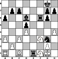 Partie-Notation im PGN-Format [Event "Zum 2.J"] [Site "www.mySchach.de"] [Date "2005.06.22"] [Round "2"] [White "Rickado"] [Black "UPS"] [ECO "D00"] [WhitemyELO "1457"] [BlackmyELO "1629"] [Result "0-1"] [TimeControl "10/2592000"] [WhiteDays "88"] [BlackDays "66"] [MySchachNr "14370"] 1. d4 d5 2. e3 Nf6 3. Nd2 a6 4. Bd3 Nc6 5. Ne2 e5 6. c3 e4 7. Bc2 Bd6 8. O-O Bg4 9. h3 Bf5 10. Ng3 Bg6 11. f4 exf3 12. Rxf3 O-O 13. Bxg6 fxg6 14. a3 Qe7 15. Ngf1 Rae8 16. Qe1 Nd8 17. Qf2 Ne6 18. Ng3 Ng5 19. Rxf6 Rxf6 20. Qe1 Qxe3+ 21. Qxe3 Rxe3 22. Ngf1 Re1 23. h4 Ne4 24. Nf3 Ng3 0-1 Stellungs-Notation im FEN-Format 6k1/1pp3pp/p2b1rp1/3p4/3P3P/P1P2Nn1/1P4P1/R1B1rNK1 - - - 3 25 Geschlagene Figuren Weiss: Geschlagene Figuren Schwarz: Klicken Sie auf eine geschlagene Figur um den gewünschten Zug darzustellen!