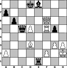 Partie-Notation im PGN-Format [Event "Bremer Schl"] [Site "www.mySchach.de"] [Date "2008.11.01"] [Round "2"] [White "Fighter"] [Black "HenrySchinasky"] [ECO "C43"] [WhitemyELO "2087"] [BlackmyELO "2045"] [Result "1-0"] [TimeControl "10/2592000"] [WhiteDays "83"] [BlackDays "96"] [MySchachNr "49464"] 1. e4 e5 2. Nf3 Nf6 3. d4 Nxe4 4. Bd3 d5 5. Nxe5 Nd7 6. Nxd7 Bxd7 7. O-O Bd6 8. c4 c6 9. cxd5 cxd5 10. Nc3 Nxc3 11. bxc3 O-O 12. Qh5 g6 13. Qxd5 Qc7 14. Bh6 Rfe8 15. h3 Be6 16. Qg5 Qxc3 17. Rfd1 f5 18. Rac1 Qa3 19. Qf6 Re7 20. Rc2 Rae8 21. d5 Bd7 22. Re2 Rf7 23. Rxe8+ Bxe8 24. Qd8 Re7 25. g3 Kf7 26. Bg5 Ba4 27. Rc1 h6 28. Rc8 Re1+ 29. Kh2 hxg5 30. Qg8+ Kf6 31. Qh8+ Kf7 32. Rg8 Bf8 33. Qh7+ Ke8 34. Qxg6+ Kd8 35. Qf6+ Qe7 36. Rxf8+ Be8 37. Qh8 Qc5 38. Rxf5 b6 39. Qf6+ 1-0 Stellungs-Notation im FEN-Format 3kb3/p7/1p3Q2/2qP1Rp1/8/3B2PP/P4P1K/4r3 - - - 1 39 Geschlagene Figuren Weiss: Geschlagene Figuren Schwarz: Klicken Sie auf eine geschlagene Figur um den gewünschten Zug darzustellen!