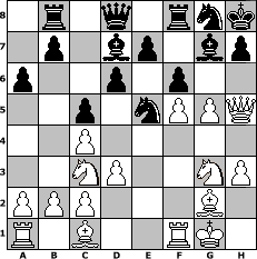 Partie-Notation im PGN-Format [Event "Krampusturnier 2"] [Site "www.mySchach.de"] [Date "2014.12.01"] [Round "1"] [White "Duschgel"] [Black "faustballer"] [ECO "A10"] [WhitemyELO "1628"] [BlackmyELO "1563"] [Result "0-1"] [TimeControl "10/1728000"] [WhiteDays "00"] [BlackDays "20"] [MySchachNr "96956"] 1. c4 g6 2. g3 Bg7 3. Bg2 c5 4. Nc3 Nf6 5. e4 Nc6 6. Nge2 O-O 7. O-O d6 8. d3 a6 9. f4 Bg4 10. h3 Bd7 11. f5 gxf5 12. exf5 Rb8 13. g4 Ne5 14. Ng3 Kh8 15. g5 Ng8 16. Qh5 f6 0-1 Stellungs-Notation im FEN-Format 1r1q1rnk/1p1bp1bp/p2p1p2/2p1nPPQ/2P5/2NP2NP/PPP3B1/R1B2RK1 - - - 0 17 Geschlagene Figuren Weiss: Geschlagene Figuren Schwarz: Klicken Sie auf eine geschlagene Figur um den gewünschten Zug darzustellen!