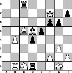 Partie-Notation im PGN-Format [Event "Mikado"] [Site "www.mySchach.de"] [Date "2014.03.15"] [Round "1"] [White "Joschi"] [Black "espero"] [ECO "C17"] [WhitemyELO "1539"] [BlackmyELO "1601"] [Result "0-1"] [TimeControl "10/2592000"] [WhiteDays "30"] [BlackDays "30"] [MySchachNr "93511"] 1. e4 e6 2. d4 d5 3. Nc3 Bb4 4. e5 c5 5. a3 Ba5 6. Qd3 cxd4 7. Qxd4 Ne7 8. Nf3 Nbc6 9. Bb5 O-O 10. Qd3 Ng6 11. Bxc6 bxc6 12. Bd2 Bc7 13. Qd4 a5 14. O-O Ba6 15. Rfe1 Qb8 16. b3 Bb6 17. Qg4 Bc7 18. Qd4 c5 19. Qxc5 Nxe5 20. Nxe5 Bxe5 21. g3 Rc8 22. Qe3 Bf6 23. Qf3 Qc7 24. Ne2 Bxa1 25. Rxa1 Qxc2 26. Qe3 Qd3 27. Nd4 Qxe3 28. Bxe3 g6 29. b4 axb4 30. axb4 Bc4 31. Rb1 e5 32. Nf3 f6 33. Bc5 Ra2 34. Be7 Kf7 35. Bc5 d4 36. Ne1 Bd5 37. Nd3 Rd2 38. Nc1 Rd1# 0-1 Stellungs-Notation im FEN-Format 2r5/5k1p/5pp1/2Bbp3/1P1p4/6P1/5P1P/1RNr2K1 - - - 6 39 Geschlagene Figuren Weiss: Geschlagene Figuren Schwarz: Klicken Sie auf eine geschlagene Figur um den gewünschten Zug darzustellen!