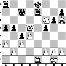 Partie-Notation im PGN-Format [Event "Schach dem" Nikolaus""] [Site "www.mySchach.de"] [Date "2009.11.28"] [Round "1"] [White "Juliette2103"] [Black "Ziegert"] [ECO "C07"] [WhitemyELO "1481"] [BlackmyELO "1548"] [Result "1-0"] [TimeControl "10/2592000"] [WhiteDays "01"] [BlackDays "35"] [MySchachNr "60963"] 1. e4 e6 2. d4 d5 3. Nd2 c5 4. c3 Qb6 5. exd5 exd5 6. Ngf3 c4 7. Be2 Nf6 8. O-O Be7 9. Qc2 O-O 10. Re1 Qd6 11. Nf1 Na6 12. Ng3 b5 13. a3 Nc7 14. Nf5 Bxf5 15. Qxf5 Ne6 16. Ne5 a5 17. Bd2 g6 18. Qh3 Ne4 19. Bh6 Rfd8 20. Bf3 N4g5 21. Qg3 Nxf3+ 22. Qxf3 f6 23. Ng4 Kf7 24. Re5 f5 25. Rae1 Rd7 26. Rxe6 Qc7 27. Rxe7+ Rxe7 28. Qxd5+ Ke8 29. Nf6# 1-0 Stellungs-Notation im FEN-Format r3k3/2q1r2p/5NpB/pp1Q1p2/2pP4/P1P5/1P3PPP/4R1K1 - - - 2 29 Geschlagene Figuren Weiss: Geschlagene Figuren Schwarz: Klicken Sie auf eine geschlagene Figur um den gewünschten Zug darzustellen!