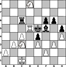 Partie-Notation im PGN-Format [Event "Schach f"] [Site "www.mySchach.de"] [Date "2008.08.25"] [Round "1"] [White "scherry"] [Black "Macks"] [ECO "D00"] [WhitemyELO "1332"] [BlackmyELO "1489"] [Result "1-0"] [TimeControl "10/2592000"] [WhiteDays "30"] [BlackDays "30"] [MySchachNr "47413"] 1. d4 d5 2. g3 Nf6 3. Bf4 a5 4. Nc3 h5 5. Bg2 Nc6 6. Nb5 Rb8 7. Bxc7 Qd7 8. Bxb8 Ne4 9. Bf4 e5 10. Bxe4 dxe4 11. dxe5 Bc5 12. Qxd7+ Bxd7 13. Nd6+ Ke7 14. Nxb7 Bd4 15. c3 Bxe5 16. Bxe5 Nxe5 17. Nxa5 Rb8 18. b3 Rc8 19. Rc1 Bg4 20. h3 Bf5 21. c4 g6 22. e3 Nd3+ 23. Kd2 Nxc1 24. Kxc1 Rc5 25. Nb7 Rc6 26. Ne2 Ra6 27. Nc3 f6 28. h4 Ke6 29. Rd1 Rc6 30. Nd8+ Ke5 31. Rd5# 1-0 Stellungs-Notation im FEN-Format 3N4/8/2r2pp1/3Rkb1p/2P1p2P/1PN1P1P1/P4P2/2K5 - - - 6 31 Geschlagene Figuren Weiss: Geschlagene Figuren Schwarz: Klicken Sie auf eine geschlagene Figur um den gewünschten Zug darzustellen!