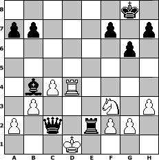Partie-Notation im PGN-Format [Event "Sweety Tunier"] [Site "www.mySchach.de"] [Date "2006.02.28"] [Round "2"] [White "Biber"] [Black "Robert"] [ECO "B20"] [WhitemyELO "1193"] [BlackmyELO "1500"] [Result "0-1"] [TimeControl "10/2592000"] [WhiteDays "112"] [BlackDays "094"] [MySchachNr "23056"] 1. e4 c5 2. d3 Nc6 3. Nc3 e6 4. Be2 Be7 5. Be3 d5 6. d4 cxd4 7. Bxd4 Nxd4 8. Qxd4 Nf6 9. Bb5+ Bd7 10. Bxd7+ Qxd7 11. exd5 Rc8 12. O-O-O O-O 13. dxe6 Qxe6 14. Nf3 Bc5 15. Qd2 Ne4 16. Nxe4 Qxe4 17. Rhe1 Qa4 18. Kb1 Qb5 19. Qd3 Qb6 20. Re2 Rcd8 21. Red2 Rxd3 22. Rxd3 Re8 23. R1d2 g6 24. b3 Ba3 25. c4 Qf6 26. Rd6 Bxd6 27. h3 Bb4 28. Rd4 Re2 29. Kc1 Qf5 30. Kd1 Qc2# 0-1 Stellungs-Notation im FEN-Format 6k1/pp3p1p/6p1/8/1bPR4/1P3N1P/P1q1rPP1/3K4 - - - 7 31 Geschlagene Figuren Weiss: Geschlagene Figuren Schwarz: Klicken Sie auf eine geschlagene Figur um den gewünschten Zug darzustellen!