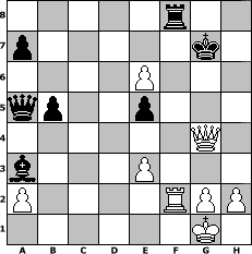 Partie-Notation im PGN-Format [Event "101 Geburtstag von Miguel Najdorf"] [Site "www.mySchach.de"] [Date "2011.04.15"] [Round "1"] [White "Chaos"] [Black "deepsabel"] [ECO "D02"] [WhitemyELO "1825"] [BlackmyELO "1964"] [Result "1/2-1/2"] [TimeControl "10/1728000"] [WhiteDays "74"] [BlackDays "79"] [MySchachNr "73337"] 1. d4 d5 2. Nf3 Nf6 3. c4 e6 4. Nc3 Nbd7 5. Bg5 c6 6. e3 Qa5 7. Nd2 dxc4 8. Bxf6 Nxf6 9. Nxc4 Qc7 10. Rc1 Be7 11. Bd3 O-O 12. O-O Rd8 13. Ne5 Bd7 14. f4 Be8 15. Qc2 c5 16. Ne4 Nxe4 17. Bxe4 g6 18. b4 Rac8 19. bxc5 b6 20. c6 f6 21. Nd3 Ba3 22. Nb2 Rd6 23. Rf2 b5 24. Qb3 Qa5 25. Rc3 Bxc6 26. Nd3 Bb7 27. Rxc8+ Bxc8 28. f5 Kg7 29. fxg6 hxg6 30. Bxg6 Rd8 31. Nf4 Rh8 32. Qd1 f5 33. d5 e5 34. Bxf5 Bxf5 35. Ne6+ Bxe6 36. dxe6 Rf8 37. Qg4+ 1/2-1/2 Stellungs-Notation im FEN-Format 5r2/p5k1/4P3/qp2p3/6Q1/b3P3/P4RPP/6K1 - - - 2 37 Geschlagene Figuren Weiss: Geschlagene Figuren Schwarz: Klicken Sie auf eine geschlagene Figur um den gewünschten Zug darzustellen!