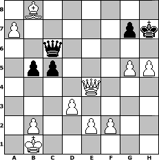 Partie-Notation im PGN-Format [Event "Bobby Fischer lebt"] [Site "www.mySchach.de"] [Date "2009.07.29"] [Round "1"] [White "sprinterde"] [Black "Andreas"] [ECO "C25"] [WhitemyELO "1644"] [BlackmyELO "1523"] [Result "1-0"] [TimeControl "10/2592000"] [WhiteDays "148"] [BlackDays "141"] [MySchachNr "57869"] 1. e4 e5 2. Nc3 Bb4 3. Nd5 Nc6 4. Nf3 Nf6 5. Nxb4 Nxb4 6. a3 Nc6 7. Bb5 O-O 8. Bxc6 dxc6 9. d3 Bg4 10. h3 Bxf3 11. Qxf3 Qd6 12. Qg3 Nh5 13. Qf3 Qg6 14. g4 Nf6 15. Be3 h5 16. g5 Nd7 17. O-O-O f5 18. exf5 Rxf5 19. Qe4 Raf8 20. Qc4+ Kh8 21. h4 Nb6 22. Qe4 Nd5 23. Bc5 R8f7 24. Bxa7 b6 25. Rhe1 Qe6 26. c4 Nf4 27. Kb1 Re7 28. a4 Rf8 29. a5 c5 30. Re3 Ng6 31. Rf3 Rxf3 32. Qxf3 Nf4 33. a6 Qd7 34. Bb8 c6 35. a7 Qb7 36. Re1 Ng6 37. Qxh5+ Kg8 38. Qxg6 b5 39. cxb5 cxb5 40. Qd6 Re8 41. Rxe5 Rxe5 42. Qxe5 Qc6 43. h5 Kh7 44. Qe4+ 1-0 Stellungs-Notation im FEN-Format 1B6/P5pk/2q5/1pp3PP/4Q3/3P4/1P2PP2/1K6 - - - 2 44 Geschlagene Figuren Weiss: Geschlagene Figuren Schwarz: Klicken Sie auf eine geschlagene Figur um den gewünschten Zug darzustellen!