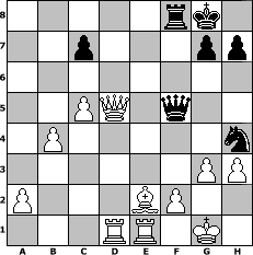Partie-Notation im PGN-Format [Event "Abermals Aljechin"] [Site "www.mySchach.de"] [Date "2011.02.13"] [Round "1"] [White "kari6katz"] [Black "reisinger"] [ECO "A52"] [WhitemyELO "1796"] [BlackmyELO "1426"] [Result "1-0"] [TimeControl "10/1728000"] [WhiteDays "80"] [BlackDays "80"] [MySchachNr "71982"] 1. d4 Nf6 2. c4 e5 3. dxe5 Ng4 4. e4 d6 5. exd6 Bxd6 6. Be2 f5 7. exf5 Qe7 8. h3 Ne5 9. Qc2 O-O 10. Be3 Bxf5 11. Qb3 Nbc6 12. Nf3 Na5 13. Qb5 Bb4+ 14. Bd2 Bxd2+ 15. Nbxd2 Nxf3+ 16. Nxf3 Bd3 17. Qd5+ Rf7 18. Qxd3 Rd8 19. Qc2 Qb4+ 20. Qc3 Qc5 21. O-O Nc6 22. Rfe1 Rdf8 23. Rad1 Ne7 24. b4 Qf5 25. Qe3 Qg6 26. Ne5 Nf5 27. Qxa7 Qg5 28. Nxf7 Rxf7 29. c5 Rf8 30. Qxb7 Nh4 31. g3 Qf5 32. Qd5+ 1-0 Stellungs-Notation im FEN-Format 5rk1/2p3pp/8/2PQ1q2/1P5n/6PP/P3BP2/3RR1K1 - - - 2 32 Geschlagene Figuren Weiss: Geschlagene Figuren Schwarz: Klicken Sie auf eine geschlagene Figur um den gewünschten Zug darzustellen!