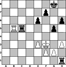 Partie-Notation im PGN-Format [Event "April 2018"] [Site "www.mySchach.de"] [Date "2018.04.11"] [Round "1"] [White "FrankB"] [Black "sprinterde"] [ECO "A40"] [WhitemyELO "1650"] [BlackmyELO "1703"] [Result "1/2-1/2"] [TimeControl "10/1728000"] [WhiteDays "65"] [BlackDays "75"] [MySchachNr "111920"] 1. d4 e6 2. Nf3 Nf6 3. c4 Bb4+ 4. Bd2 Bxd2+ 5. Qxd2 Nc6 6. Nc3 O-O 7. e3 d5 8. Rc1 dxc4 9. Bxc4 a6 10. a3 b5 11. Be2 Bb7 12. b4 Ne7 13. O-O Ned5 14. h3 Qd6 15. Ne5 Nd7 16. Nxd7 Qxd7 17. Bf3 Ra7 18. Rc2 Nb6 19. Bxb7 Rxb7 20. Ne4 Qd5 21. Nc5 Ra7 22. Qd3 Rd8 23. Rfc1 Nc4 24. Rc3 a5 25. Ne4 axb4 26. axb4 Ra2 27. R1c2 Ra1+ 28. Kh2 Ne5 29. Qe2 Qxe4 30. dxe5 Rdd1 31. Qg4 Rh1+ 32. Kg3 Qxe5+ 33. Qf4 Qxf4+ 34. Kxf4 Rab1 35. Rxc7 Rxb4+ 36. Kf3 g5 37. R2c5 h6 38. Rb7 Rc4 39. Rbxb5 Rxc5 1/2-1/2 Stellungs-Notation im FEN-Format 6k1/5p2/4p2p/1Rr3p1/8/4PK1P/5PP1/7r - - - 0 40 Geschlagene Figuren Weiss: ![]() ![]() ![]() ![]() ![]() ![]() ![]() ![]() ![]() ![]() ![]() ![]() ![]() ![]() ![]() Geschlagene Figuren Schwarz: ![]() ![]() ![]() ![]() ![]() ![]() ![]() ![]() ![]() ![]() ![]() ![]() ![]() ![]() ![]() Klicken Sie auf eine geschlagene Figur um den gewünschten Zug darzustellen!