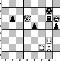 Partie-Notation im PGN-Format [Event "^^Frohes neues Jahr^^"] [Site "www.mySchach.de"] [Date "2007.12.29"] [Round "1"] [White "BobbyF4"] [Black "freizeitspieler"] [ECO "C34"] [WhitemyELO "1520"] [BlackmyELO "1570"] [Result "1/2-1/2"] [TimeControl "10/864000"] [WhiteDays "58"] [BlackDays "58"] [MySchachNr "41107"] 1. e4 e5 2. f4 exf4 3. Nf3 d6 4. Bc4 Bg4 5. O-O h6 6. d4 g5 7. h3 Bh5 8. Nc3 Nd7 9. e5 dxe5 10. b3 Bb4 11. Nd5 Bd6 12. Qe1 f6 13. Qe4 c6 14. Nc3 Qb6 15. Na4 Qc7 16. Be6 Ne7 17. c4 Bxf3 18. Qxf3 exd4 19. Qh5+ Kd8 20. a3 c5 21. Bd2 Ne5 22. Qe2 N7g6 23. Bf5 Ne7 24. Be6 h5 25. Kh1 g4 26. Bxf4 gxh3 27. Bxh3 N7g6 28. Bh2 Ng4 29. Qe4 N6e5 30. Bg3 Ke7 31. Bh4 Raf8 32. Rae1 Rf7 33. b4 cxb4 34. Qxd4 b6 35. axb4 Bxb4 36. Re2 Rg8 37. Nc3 Bxc3 38. Qxc3 Kf8 39. Bg3 Qxc4 40. Qe1 Qb5 41. Bxe5 fxe5 42. Rxf7+ Kxf7 43. g3 Qd5+ 44. Bg2 Qc5 45. Bf3 Ke6 46. Kg2 Rd8 47. Qb1 Ne3+ 48. Kh3 Kf6 49. Qh7 Qc8+ 50. Kh2 Ng4+ 51. Kg2 Rh8 52. Qxa7 Qb8 53. Qa4 Qc7 54. Qe4 Rg8 55. Bxg4 Rxg4 56. Rf2+ Kg7 57. Qf5 Kh6 58. Qf8+ Qg7 59. Qd6+ Rg6 1/2-1/2 Stellungs-Notation im FEN-Format 8/6q1/1p1Q2rk/4p2p/8/6P1/5RK1/8 - - - 8 60 Geschlagene Figuren Weiss: ![]() ![]() ![]() ![]() ![]() ![]() ![]() ![]() ![]() ![]() ![]() ![]() ![]() ![]() ![]() Geschlagene Figuren Schwarz: ![]() ![]() ![]() ![]() ![]() ![]() ![]() ![]() ![]() ![]() ![]() ![]() ![]() ![]() ![]() Klicken Sie auf eine geschlagene Figur um den gewünschten Zug darzustellen!