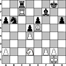 | Partie-Notation im PGN-Format [Event "Aljechin zu Mittag"] [Site "www.mySchach.de"] [Date "2006.04.18"] [Round "1"] [White "Andreas"] [Black "Juliette2103"] [ECO "A83"] [WhitemyELO "1563"] [BlackmyELO "1932"] [Result "1/2-1/2"] [TimeControl "10/1728000"] [WhiteDays "20"] [BlackDays "20"] [MySchachNr "24644"] 1. d4 f5 2. e4 fxe4 3. Nc3 Nf6 4. Bg5 g6 5. h4 d5 6. h5 Bf5 7. hxg6 Bxg6 8. Qd2 Bg7 9. Nge2 Nc6 10. Nf4 Bf7 11. Bb5 a6 12. Bxc6+ bxc6 13. O-O h6 14. Bh4 Qd6 15. Bg3 Qb4 16. Nxe4 Qxb2 17. c3 Qxd2 18. Nxd2 O-O 19. Rfe1 Rfe8 20. Nd3 Ra7 21. Rab1 Nd7 22. Nb4 c5 23. Nc6 Raa8 24. Rb7 cxd4 25. cxd4 e6 26. Rxc7 Nb6 27. Ne5 Bxe5 28. Bxe5 Rac8 29. Rec1 Rxc7 30. Rxc7 Rc8 1/2-1/2 Stellungs-Notation im FEN-Format 2r3k1/2R2b2/pn2p2p/3pB3/3P4/8/P2N1PP1/6K1 - - - 1 31 Geschlagene Figuren Weiss:                              Geschlagene Figuren Schwarz:                               Klicken Sie auf eine geschlagene Figur um den gewünschten Zug darzustellen!