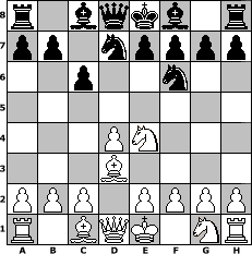 Partie-Notation im PGN-Format [Event "Enkel-Cup 2010"] [Site "www.mySchach.de"] [Date "2010.03.20"] [Round "1"] [White "Theresa"] [Black "Joschi"] [ECO "B17"] [WhitemyELO "1697"] [BlackmyELO "1550"] [Result "0-1"] [TimeControl "10/2592000"] [WhiteDays "00"] [BlackDays "30"] [MySchachNr "64138"] 1. e4 c6 2. d4 d5 3. Nc3 dxe4 4. Nxe4 Nd7 5. Bd3 Ngf6 0-1 Stellungs-Notation im FEN-Format r1bqkb1r/pp1npppp/2p2n2/8/3PN3/3B4/PPP1PPPP/R1BQK1NR - KQkq - 3 6 Geschlagene Figuren Weiss: Geschlagene Figuren Schwarz: Klicken Sie auf eine geschlagene Figur um den gewünschten Zug darzustellen!