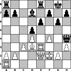 Partie-Notation im PGN-Format [Event "Blitz Open 2010 Part One"] [Site "www.mySchach.de"] [Date "2010.03.04"] [Round "1"] [White "Tomino"] [Black "Zoidberg"] [ECO "A48"] [WhitemyELO "1788"] [BlackmyELO "1826"] [Result "1/2-1/2"] [TimeControl "10/86400"] [WhiteDays "01"] [BlackDays "01"] [MySchachNr "63728"] 1. d4 Nf6 2. Nf3 g6 3. Bf4 Bg7 4. e3 O-O 5. h3 d5 6. Be2 c5 7. c3 cxd4 8. exd4 Nbd7 9. Nbd2 Re8 10. Ne5 Nxe5 11. Bxe5 Nd7 12. Bxg7 Kxg7 13. O-O Nf6 14. Bd3 Nh5 15. f4 Ng3 16. Rf3 Nf5 17. Qe2 Kg8 18. Nf1 Bd7 19. Ne3 Nxe3 20. Rxe3 e6 21. Kf2 Qh4+ 1/2-1/2 Stellungs-Notation im FEN-Format r3r1k1/pp1b1p1p/4p1p1/3p4/3P1P1q/2PBR2P/PP2QKP1/R7 - - - 2 22 Geschlagene Figuren Weiss: Geschlagene Figuren Schwarz: Klicken Sie auf eine geschlagene Figur um den gewünschten Zug darzustellen!