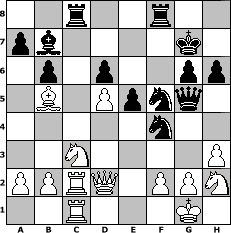 Partie-Notation im PGN-Format [Event "Relax 2009"] [Site "www.mySchach.de"] [Date "2009.05.20"] [Round "1"] [White "RashimIbenRohal"] [Black "martinus"] [ECO "E73"] [WhitemyELO "1540"] [BlackmyELO "1890"] [Result "0-1"] [TimeControl "10/3456000"] [WhiteDays "106"] [BlackDays "112"] [MySchachNr "55900"] 1. d4 Nf6 2. c4 g6 3. Nc3 Bg7 4. e4 d6 5. Be2 O-O 6. Nf3 Nc6 7. O-O Re8 8. h3 e5 9. d5 Ne7 10. Bg5 b6 11. Qd2 Bb7 12. Bh6 c6 13. Bxg7 Kxg7 14. Rac1 cxd5 15. cxd5 Rc8 16. Rc2 Nh5 17. Ng5 Nf4 18. Bb5 Rf8 19. Rfc1 h6 20. Nf3 f5 21. exf5 Nxf5 22. Nh2 Qg5 0-1 Stellungs-Notation im FEN-Format 2r2r2/pb4k1/1p1p2pp/1B1Ppnq1/5n2/2N4P/PPRQ1PPN/2R3K1 - - - 2 23 Geschlagene Figuren Weiss: Geschlagene Figuren Schwarz: Klicken Sie auf eine geschlagene Figur um den gewünschten Zug darzustellen!