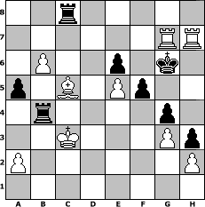 Partie-Notation im PGN-Format [Event "Einfach nur Schach 4"] [Site "www.mySchach.de"] [Date "2024.01.26"] [Round "2"] [White "Achimkogge"] [Black "Andreas1954"] [ECO "D00"] [WhitemyELO "1320"] [BlackmyELO "1238"] [Result "1-0"] [TimeControl "10/864000"] [WhiteDays "49"] [BlackDays "50"] [MySchachNr "131475"] 1. d4 d5 2. c3 e6 3. Nf3 h6 4. Ne5 Bd6 5. Bf4 g5 6. Bg3 Bxe5 7. Bxe5 f6 8. Bg3 h5 9. f3 h4 10. Bf2 Nc6 11. b4 Qe7 12. Qa4 Bd7 13. b5 Nd8 14. e3 c6 15. b6 c5 16. Bb5 a6 17. Bxd7+ Qxd7 18. Qxd7+ Kxd7 19. dxc5 Kc6 20. e4 dxe4 21. fxe4 g4 22. Nd2 f5 23. e5 Nf7 24. Bd4 Kd5 25. O-O-O Rc8 26. Nb3 Ne7 27. Na5 Rb8 28. c4+ Ke4 29. Rhe1+ Kf4 30. Rf1+ Kg5 31. Be3+ Kg6 32. Rd7 Rhe8 33. Bf4 Nd8 34. Rfd1 Kf7 35. Bg5 h3 36. g3 Rc8 37. Nxb7 Nxb7 38. Rxb7 Rxc5 39. Kb2 Rxc4 40. Rdd7 Rb4+ 41. Kc3 a5 42. Bxe7 Rc8+ 43. Bc5+ Kg6 44. Rg7+ Kh5 45. Rh7+ Kg6 46. Rbg7# 1-0 Stellungs-Notation im FEN-Format 2r5/6RR/1P2p1k1/p1B1Pp2/1r4p1/2K3Pp/P6P/8 - - - 8 46 Geschlagene Figuren Weiss: Geschlagene Figuren Schwarz: Klicken Sie auf eine geschlagene Figur um den gewünschten Zug darzustellen!