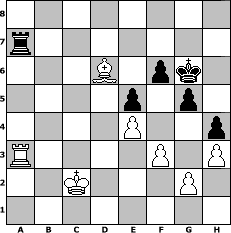 Partie-Notation im PGN-Format [Event "\" Gehirn Jogging A 2 \""] [Site "www.mySchach.de"] [Date "2011.12.23"] [Round "1"] [White "kalle"] [Black "Vahl1"] [ECO "D20"] [WhitemyELO "1577"] [BlackmyELO "1583"] [Result "1-0"] [TimeControl "10/1728000"] [WhiteDays "17"] [BlackDays "00"] [MySchachNr "78507"] 1. d4 d5 2. c4 dxc4 3. e3 Nf6 4. Bxc4 e6 5. Nf3 c5 6. O-O Nc6 7. Ne5 Nxe5 8. dxe5 Qxd1 9. Rxd1 Be7 10. exf6 Bxf6 11. Bb5+ Ke7 12. a4 a6 13. Be2 e5 14. e4 Be6 15. Be3 b6 16. Na3 Bb3 17. Rd2 Rhd8 18. Bc4 Rxd2 19. Bxd2 Bxa4 20. Be3 Bc6 21. f3 Ke8 22. Rd1 Be7 23. Bd5 Bxd5 24. Rxd5 f6 25. b3 Rc8 26. Nc4 Rc6 27. Kf2 b5 28. Nd2 c4 29. bxc4 bxc4 30. Ke2 Bb4 31. Kd1 c3 32. Nb3 c2+ 33. Ke2 a5 34. Bd2 a4 35. Nc1 Bc5 36. Rd3 Bg1 37. h3 Bd4 38. Ra3 Ra6 39. Kd3 Bb2 40. Ra2 a3 41. Kxc2 Rc6+ 42. Kd1 Rb6 43. Ne2 Rb3 44. Kc2 Rb7 45. Nc3 Kf7 46. Na4 Bd4 47. Rxa3 h5 48. Nc3 Bxc3 49. Rxc3 h4 50. Be3 g5 51. Bc5 Kg6 52. Bd6 Ra7 53. Ra3 1-0 Stellungs-Notation im FEN-Format 8/r7/3B1pk1/4p1p1/4P2p/R4P1P/2K3P1/8 - - - 5 53 Geschlagene Figuren Weiss: Geschlagene Figuren Schwarz: Klicken Sie auf eine geschlagene Figur um den gewünschten Zug darzustellen!