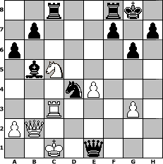 Partie-Notation im PGN-Format [Event "Sommer"] [Site "www.mySchach.de"] [Date "2015.07.14"] [Round "1"] [White "Hobbykegler"] [Black "reisinger"] [ECO "A30"] [WhitemyELO "1115"] [BlackmyELO "1479"] [Result "0-1"] [TimeControl "10/1728000"] [WhiteDays "30"] [BlackDays "60"] [MySchachNr "99716"] 1. c4 c5 2. b3 Nc6 3. Bb2 e6 4. Qc2 d5 5. cxd5 exd5 6. g3 Nf6 7. Nc3 g6 8. e3 a6 9. Nf3 Bf5 10. d3 c4 11. bxc4 dxc4 12. dxc4 Bg7 13. Nd5 O-O 14. Bd3 Nxd5 15. cxd5 Bxb2 16. Qxb2 Qa5+ 17. Nd2 Bxd3 18. Rc1 Qxd5 19. f3 Bb5 20. e4 Qd3 21. Nb3 Qxf3 22. Rc3 Qxh1+ 23. Kd2 Qxh2+ 24. Kc1 Qg1+ 25. Kc2 Rac8 26. Nc5 Nd4+ 27. Kd2 Qf2+ 28. Kc1 Qe1# 0-1 Stellungs-Notation im FEN-Format 2r2rk1/1p3p1p/p5p1/1bN5/3nP3/2R3P1/PQ6/2K1q3 - - - 10 29 Geschlagene Figuren Weiss: Geschlagene Figuren Schwarz: Klicken Sie auf eine geschlagene Figur um den gewünschten Zug darzustellen!