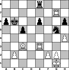 Partie-Notation im PGN-Format [Event "?"] [Site "www.mySchach.de"] [Date "2025.11.01"] [Round "?"] [White "deepsabel"] [Black "Winston"] [ECO "D21"] [WhitemyELO "1802"] [BlackmyELO "1539"] [Result "1-0"] [TimeControl "10/2592000"] [WhiteDays "116"] [BlackDays "120"] [MySchachNr "133894"] 1. d4 d5 2. c4 dxc4 3. Nf3 c6 4. a4 h6 5. Nc3 Nf6 6. e3 Be6 7. Ne5 a6 8. Bxc4 Bxc4 9. Nxc4 e6 10. O-O Nbd7 11. a5 Qc7 12. Re1 Rd8 13. h3 Bb4 14. e4 Nc5 15. e5 Nh7 16. Nd6+ Ke7 17. dxc5 Bxc5 18. Nce4 Bxd6 19. exd6+ Rxd6 20. Qxd6+ Qxd6 21. Nxd6 Kxd6 22. Bd2 Rg8 23. Bc3 c5 24. Rad1+ Kc6 25. Re3 Kb5 26. Rd7 b6 27. axb6 Kxb6 28. Rxf7 Ng5 29. Rxg7 Re8 30. h4 1-0 Stellungs-Notation im FEN-Format 4r3/6R1/pk2p2p/2p3n1/7P/2B1R3/1P3PP1/6K1 - - - 0 30 Geschlagene Figuren Weiss: Geschlagene Figuren Schwarz: Klicken Sie auf eine geschlagene Figur um den gewünschten Zug darzustellen!