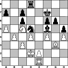 Partie-Notation im PGN-Format [Event "Fernschachmeisterschaft Sfr. Heimersheim 2004"] [Site "www.mySchach.de"] [Date "2004.03.16"] [Round "2"] [White "miu"] [Black "MisterBean"] [ECO "C65"] [WhitemyELO "1500"] [BlackmyELO "1680"] [Result "1/2-1/2"] [TimeControl "10/2592000"] [WhiteDays "116"] [BlackDays "114"] [MySchachNr "3075"] 1. e4 e5 2. Nf3 Nc6 3. Bb5 Nf6 4. O-O Bc5 5. c3 O-O 6. Bxc6 dxc6 7. Nxe5 Nxe4 8. d4 Be7 9. Re1 Nd6 10. Bf4 Bf6 11. Nd2 Be6 12. Nb3 Rb8 13. Nc5 Bf5 14. g4 Bc8 15. Bg3 g6 16. f4 Bg7 17. h4 f6 18. Qb3+ Kh8 19. Nxc6 bxc6 20. Qxb8 Bxg4 21. Qxd8 Rxd8 22. Re7 Nf5 23. Rxg7 Nxg7 24. Re1 Nf5 25. Kf2 Kg8 26. b4 Kf7 27. a4 Ne7 28. Ke3 Nd5+ 29. Kd2 Bf5 30. a5 h5 31. Na6 Rd7 32. Nc5 Rd8 1/2-1/2 Stellungs-Notation im FEN-Format 3r4/p1p2k2/2p2pp1/P1Nn1b1p/1P1P1P1P/2P3B1/3KP3/4R3 - - - 4 33 Geschlagene Figuren Weiss: ![]() ![]() ![]() ![]() ![]() ![]() ![]() ![]() ![]() ![]() ![]() ![]() ![]() ![]() ![]() Geschlagene Figuren Schwarz: ![]() ![]() ![]() ![]() ![]() ![]() ![]() ![]() ![]() ![]() ![]() ![]() ![]() ![]() ![]() Klicken Sie auf eine geschlagene Figur um den gewünschten Zug darzustellen!