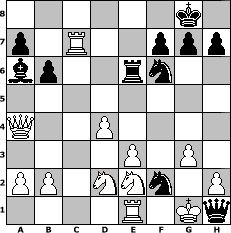 Partie-Notation im PGN-Format [Event "Katalanische Verteidigung"] [Site "www.mySchach.de"] [Date "2015.02.07"] [Round "1"] [White "Naunhofer"] [Black "LouisaN"] [ECO "E01"] [WhitemyELO "1628"] [BlackmyELO "1481"] [Result "0-1"] [TimeControl "10/2592000"] [WhiteDays "60"] [BlackDays "58"] [MySchachNr "98016"] 1. d4 Nf6 2. c4 e6 3. g3 d5 4. Bg2 Bb4+ 5. Bd2 Bxd2+ 6. Nxd2 O-O 7. e3 Nc6 8. Ne2 b6 9. O-O Re8 10. Rc1 Ba6 11. cxd5 Nb4 12. dxe6 Rxe6 13. Bxa8 Qxa8 14. Re1 Nd3 15. Rxc7 Nxf2 16. Qa4 Qh1+ 0-1 Stellungs-Notation im FEN-Format 6k1/p1R2ppp/bp2rn2/8/Q2P4/4P1P1/PP1NNn1P/4R1Kq - - - 2 17 Geschlagene Figuren Weiss: Geschlagene Figuren Schwarz: Klicken Sie auf eine geschlagene Figur um den gewünschten Zug darzustellen!