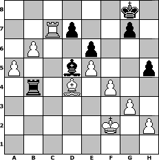 Partie-Notation im PGN-Format [Event "Trainingslager II"] [Site "www.mySchach.de"] [Date "2011.05.24"] [Round "2"] [White "Lemmi11"] [Black "Helmut48"] [ECO "A80"] [WhitemyELO "1706"] [BlackmyELO "1880"] [Result "1-0"] [TimeControl "10/1728000"] [WhiteDays "20"] [BlackDays "20"] [MySchachNr "74175"] 1. d4 f5 2. Nf3 Nf6 3. e3 e6 4. c4 b6 5. Nc3 Bd6 6. Bd3 Bb7 7. a3 a5 8. O-O O-O 9. b3 Ne4 10. Bxe4 fxe4 11. Nd2 Rf5 12. Qe2 c5 13. Bb2 cxd4 14. exd4 Qh4 15. g3 Qh5 16. Qxh5 Rxh5 17. Ndxe4 Be7 18. Rfe1 Na6 19. Na4 b5 20. Nb6 Rd8 21. Bc3 a4 22. bxa4 bxc4 23. Nd2 Nc7 24. Ndxc4 Nd5 25. Nxd5 Bxd5 26. Nb6 Bb7 27. Re5 Rxe5 28. dxe5 Bc5 29. a5 Rf8 30. Be1 Bc6 31. Rd1 Rf7 32. Rd3 h5 33. Rc3 Bd4 34. Rc4 Bxb6 35. axb6 Rf8 36. a4 Rf3 37. Bc3 Rd3 38. f4 Rd1+ 39. Kf2 Rb1 40. Bd4 Bd5 41. Rc7 Rb4 42. a5 1-0 Stellungs-Notation im FEN-Format 6k1/2Rp2p1/1P2p3/P2bP2p/1r1B1P2/6P1/5K1P/8 - - - 0 42 Geschlagene Figuren Weiss: Geschlagene Figuren Schwarz: Klicken Sie auf eine geschlagene Figur um den gewünschten Zug darzustellen!