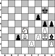 Partie-Notation im PGN-Format [Event "?"] [Site "www.mySchach.de"] [Date "2025.11.01"] [Round "?"] [White "Lohl"] [Black "Winston"] [ECO "B28"] [WhitemyELO "1264"] [BlackmyELO "1539"] [Result "1-0"] [TimeControl "10/2592000"] [WhiteDays "150"] [BlackDays "150"] [MySchachNr "133867"] 1. e4 c5 2. Nf3 a6 3. c4 Nc6 4. d4 cxd4 5. Nxd4 e5 6. Nxc6 bxc6 7. Bd3 Bb4+ 8. Bd2 Bxd2+ 9. Nxd2 Nf6 10. O-O Bb7 11. c5 d6 12. b4 dxc5 13. Bc4 cxb4 14. Qa4 a5 15. Rad1 Qc7 16. Nb3 O-O 17. Nc5 Bc8 18. a3 Rb8 19. Rfe1 bxa3 20. Qxa3 Rb4 21. Ba2 Rd4 22. Nb3 Rxd1 23. Rxd1 Nxe4 24. Nxa5 Rd8 25. Rxd8+ Qxd8 26. Bb3 Qb6 27. Qa2 Nd6 28. Nc4 Qc5 29. Qa5 Qxa5 30. Nxa5 c5 31. f3 g5 32. Bc2 c4 33. Nc6 Kg7 34. Nxe5 f6 35. Nc6 c3 36. Kf2 Ba6 37. Ke3 Bf1 38. g3 Bg2 39. Kf2 Bh3 40. g4 Nb5 41. Bd3 Nd4 42. Nxd4 h5 43. Kg3 1-0 Stellungs-Notation im FEN-Format 8/6k1/5p2/6pp/3N2P1/2pB1PKb/4P2P/8 - - - 1 43 Geschlagene Figuren Weiss: Geschlagene Figuren Schwarz: Klicken Sie auf eine geschlagene Figur um den gewünschten Zug darzustellen!