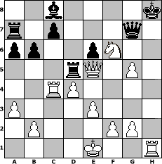 Partie-Notation im PGN-Format [Event "Wrixum - Open die XII"] [Site "www.mySchach.de"] [Date "2014.10.09"] [Round "1"] [White "pepo47"] [Black "Master1"] [ECO "A45"] [WhitemyELO "2068"] [BlackmyELO "1286"] [Result "1-0"] [TimeControl "10/2592000"] [WhiteDays "89"] [BlackDays "78"] [MySchachNr "96285"] 1. d4 Nf6 2. Bg5 d5 3. e3 e6 4. Nd2 Be7 5. Ngf3 O-O 6. c4 Ne4 7. Bxe7 Qxe7 8. Qc2 Nxd2 9. Nxd2 a6 10. Rc1 Nc6 11. a3 Rd8 12. Bd3 dxc4 13. Bxh7+ Kh8 14. Be4 Na5 15. Qc3 f5 16. Qxa5 fxe4 17. Rxc4 g5 18. Nxe4 b6 19. Qe5+ Qg7 20. Nf6 Ra7 21. h4 Rd5 22. hxg5+ 1-0 Stellungs-Notation im FEN-Format 2b4k/r1p3q1/pp2pN2/3rQ1P1/2RP4/P3P3/1P3PP1/4K2R - K - 0 22 Geschlagene Figuren Weiss: ![]() ![]() ![]() ![]() ![]() ![]() ![]() ![]() ![]() ![]() ![]() ![]() ![]() ![]() ![]() Geschlagene Figuren Schwarz: ![]() ![]() ![]() ![]() ![]() ![]() ![]() ![]() ![]() ![]() ![]() ![]() ![]() ![]() ![]() Klicken Sie auf eine geschlagene Figur um den gewünschten Zug darzustellen!