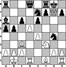 Partie-Notation im PGN-Format [Event "Trainingslager II"] [Site "www.mySchach.de"] [Date "2011.05.24"] [Round "1"] [White "reisender"] [Black "augustus"] [ECO "A40"] [WhitemyELO "1322"] [BlackmyELO "1236"] [Result "1-0"] [TimeControl "10/1728000"] [WhiteDays "20"] [BlackDays "18"] [MySchachNr "74106"] 1. d4 e6 2. e4 d5 3. Nc3 Bb4 4. Bd2 Nc6 5. Nf3 Bxc3 6. Bxc3 dxe4 7. Nd2 Nf6 8. Qe2 O-O 9. O-O-O Qd5 10. Kb1 b6 11. f3 a5 12. fxe4 Qd8 13. Nf3 Ba6 14. Qe3 Ng4 15. Qd2 b5 16. d5 Ne7 17. Qd4 c6 18. Qxg7# 1-0 Stellungs-Notation im FEN-Format r2q1rk1/4npQp/b1p1p3/pp1P4/4P1n1/2B2N2/PPP3PP/1K1R1B1R - - - 0 18 Geschlagene Figuren Weiss: Geschlagene Figuren Schwarz: Klicken Sie auf eine geschlagene Figur um den gewünschten Zug darzustellen!