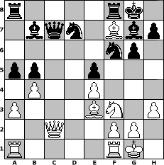 Partie-Notation im PGN-Format [Event "?"] [Site "www.mySchach.de"] [Date "2025.11.07"] [Round "?"] [White "kalle"] [Black "Seneca"] [ECO "A42"] [WhitemyELO "1598"] [BlackmyELO "1524"] [Result "1-0"] [TimeControl "10/1728000"] [WhiteDays "23"] [BlackDays "39"] [MySchachNr "133924"] 1. d4 d6 2. c4 Nf6 3. Nc3 c6 4. e4 g6 5. Nf3 Bg7 6. Be3 O-O 7. Bd3 a6 8. h3 b5 9. Qd2 Bb7 10. O-O Nbd7 11. b4 bxc4 12. Bxc4 e5 13. a3 Qc7 14. dxe5 dxe5 15. Qc2 a5 16. Nb5 cxb5 17. Bxf7+ 1-0 Stellungs-Notation im FEN-Format r4rk1/1bqn1Bbp/5np1/pp2p3/1P2P3/P3BN1P/2Q2PP1/R4RK1 - - - 0 17 Geschlagene Figuren Weiss: Geschlagene Figuren Schwarz: Klicken Sie auf eine geschlagene Figur um den gewünschten Zug darzustellen!