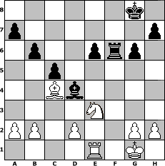 Partie-Notation im PGN-Format [Event "Albspiele 5"] [Site "www.mySchach.de"] [Date "2010.07.03"] [Round "1"] [White "Knight"] [Black "Haki"] [ECO "E76"] [WhitemyELO "1158"] [BlackmyELO "1274"] [Result "0-1"] [TimeControl "10/1728000"] [WhiteDays "20"] [BlackDays "20"] [MySchachNr "66777"] 1. d4 Nf6 2. c4 g6 3. Nc3 Bg7 4. e4 d6 5. f4 O-O 6. Nf3 c5 7. d5 e6 8. dxe6 fxe6 9. Bd3 Nc6 10. O-O Nd4 11. e5 Nxf3+ 12. Qxf3 dxe5 13. fxe5 Nd7 14. Qd1 Nxe5 15. Be2 Rxf1+ 16. Bxf1 Qxd1 17. Nxd1 b6 18. Bf4 Ba6 19. Ne3 Rf8 20. Bxe5 Bxe5 21. Rb1 Bd4 22. Re1 Bxc4 23. Bxc4 Rf6 0-1 Stellungs-Notation im FEN-Format 6k1/p6p/1p2prp1/2p5/2Bb4/4N3/PP1P2PP/4R1K1 - - - 1 24 Geschlagene Figuren Weiss: Geschlagene Figuren Schwarz: Klicken Sie auf eine geschlagene Figur um den gewünschten Zug darzustellen!