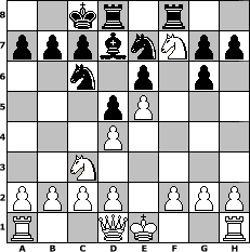 Partie-Notation im PGN-Format [Event "Helmut-Rahn-Gedenkturnier"] [Site "www.mySchach.de"] [Date "2003.08.28"] [Round "2"] [White "duc"] [Black "cHe"] [ECO "D01"] [WhitemyELO "1467"] [BlackmyELO "1438"] [Result "0-1"] [TimeControl "10/3456000"] [WhiteDays "00"] [BlackDays "58"] [MySchachNr "937"] 1. d4 d5 2. Nc3 e6 3. Bf4 Nc6 4. e4 Bd7 5. Nf3 Qf6 6. Bg5 Qg6 7. Bd3 Bd6 8. e5 Be7 9. Bxg6 fxg6 10. Bxe7 Ngxe7 11. Ng5 O-O-O 12. Nf7 Rhf8 0-1 Stellungs-Notation im FEN-Format 2kr1r2/pppbnNpp/2n1p1p1/3pP3/3P4/2N5/PPPP1PPP/R2QK2R - KQ - 4 13 Geschlagene Figuren Weiss: Geschlagene Figuren Schwarz: Klicken Sie auf eine geschlagene Figur um den gewünschten Zug darzustellen!