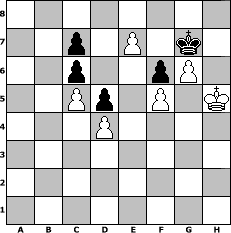 Partie-Notation im PGN-Format [Event "?"] [Site "www.mySchach.de"] [Date "2021.07.20"] [Round "?"] [White "beowulf"] [Black "borsti"] [ECO "A21"] [WhitemyELO "1377"] [BlackmyELO "1282"] [Result "1-0"] [TimeControl "10/864000"] [WhiteDays "50"] [BlackDays "50"] [MySchachNr "122583"] 1. c4 e5 2. Nc3 a6 3. g3 Nc6 4. Bg2 Bb4 5. Nf3 d6 6. O-O Bxc3 7. bxc3 Nf6 8. d4 Bg4 9. Bg5 h6 10. Bxf6 Qxf6 11. h3 Bxf3 12. Bxf3 O-O 13. Bg2 exd4 14. Bxc6 bxc6 15. cxd4 Rfd8 16. e3 a5 17. a4 Rdb8 18. Qc2 Rb4 19. c5 d5 20. Rfb1 Rab8 21. Rxb4 Rxb4 22. Rb1 Qd8 23. Rxb4 axb4 24. Qb3 Qb8 25. Kg2 g5 26. f4 Kg7 27. f5 Kf6 28. g4 h5 29. Kf3 Qb7 30. e4 Ke7 31. e5 f6 32. e6 Qb8 33. a5 Qb5 34. a6 Qxa6 35. Qxb4 Qa7 36. gxh5 Qa8 37. Qe1 Qh8 38. Kg4 Qh6 39. Qe3 Qf8 40. h4 gxh4 41. Kxh4 Qg8 42. Qg3 Qh7 43. Qg6 Qxg6 44. hxg6 Kf8 45. Kh5 Kg7 46. e7 1-0 Stellungs-Notation im FEN-Format 8/2p1P1k1/2p2pP1/2Pp1P1K/3P4/8/8/8 - - - 0 46 Geschlagene Figuren Weiss: Geschlagene Figuren Schwarz: Klicken Sie auf eine geschlagene Figur um den gewünschten Zug darzustellen!