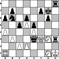 Partie-Notation im PGN-Format [Event "Bis1400"] [Site "www.mySchach.de"] [Date "2009.06.21"] [Round "1"] [White "Knight"] [Black "reisender"] [ECO "A40"] [WhitemyELO "1134"] [BlackmyELO "1361"] [Result "0-1"] [TimeControl "10/2592000"] [WhiteDays "117"] [BlackDays "089"] [MySchachNr "56776"] 1. d4 g6 2. e4 Bg7 3. Nc3 e6 4. Nf3 Nf6 5. Bg5 O-O 6. Bd3 d6 7. O-O c5 8. d5 Qd7 9. Re1 e5 10. Bb5 Qe7 11. a4 a6 12. Bc4 h6 13. Bxf6 Qxf6 14. Re3 Nd7 15. b3 h5 16. h3 Bh6 17. Nh2 Bxe3 18. fxe3 Nb6 19. Be2 Qg5 20. g4 hxg4 21. Bxg4 Kg7 22. Nf3 Qh6 23. Kg2 Rh8 24. Ng1 Bxg4 25. Qxg4 Qxe3 26. Nce2 Rh6 27. Kh1 Rah8 28. Ng3 Rh4 29. Qf3 Rxh3+ 0-1 Stellungs-Notation im FEN-Format 7r/1p3pk1/pn1p2p1/2pPp3/P3P3/1P2qQNr/2PP4/R5NK - - - 0 30 Geschlagene Figuren Weiss: Geschlagene Figuren Schwarz: Klicken Sie auf eine geschlagene Figur um den gewünschten Zug darzustellen!