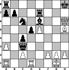 | Partie-Notation im PGN-Format [Event "Winawer"] [Site "www.mySchach.de"] [Date "2004.02.10"] [Round "1"] [White "kalle"] [Black "Zoltan"] [ECO "C18"] [WhitemyELO "1646"] [BlackmyELO "1578"] [Result "1/2-1/2"] [TimeControl "10/2592000"] [WhiteDays "82"] [BlackDays "89"] [MySchachNr "2242"] 1. e4 e6 2. d4 d5 3. Nc3 Bb4 4. e5 c5 5. a3 Bxc3 6. bxc3 Ne7 7. Qg4 O-O 8. Nf3 Qa5 9. Bd2 c4 10. Be2 Nbc6 11. O-O f6 12. Nh4 fxe5 13. Bh6 Rf7 14. Qg3 Nf5 15. Nxf5 exf5 16. dxe5 Kh8 17. Bh5 Re7 18. Bf4 Be6 19. Rfd1 h6 20. Qe3 g5 21. Bg3 f4 22. Bxf4 gxf4 23. Qxf4 Qxc3 24. Qxh6+ Kg8 25. Qg6+ Kh8 26. Qh6+ 1/2-1/2 Stellungs-Notation im FEN-Format r6k/pp2r3/2n1b2Q/3pP2B/2p5/P1q5/2P2PPP/R2R2K1 - - - 4 26 Geschlagene Figuren Weiss:                              Geschlagene Figuren Schwarz:                               Klicken Sie auf eine geschlagene Figur um den gewünschten Zug darzustellen!