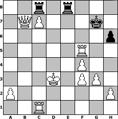 Partie-Notation im PGN-Format [Event "Herbstopen"] [Site "www.mySchach.de"] [Date "2008.09.26"] [Round "1"] [White "Master1"] [Black "Haneken"] [ECO "D03"] [WhitemyELO "1255"] [BlackmyELO "1452"] [Result "1-0"] [TimeControl "10/864000"] [WhiteDays "35"] [BlackDays "33"] [MySchachNr "48410"] 1. d4 d5 2. Nf3 Nf6 3. Bg5 Ne4 4. Nbd2 Bf5 5. e3 Bg4 6. Bh4 g5 7. Bg3 Bg7 8. Be2 Nc6 9. Nxe4 dxe4 10. Nd2 Bxe2 11. Qxe2 Qd5 12. Bxc7 Nb4 13. c4 Qc6 14. Qd1 Nd3+ 15. Ke2 Qxc7 16. f3 Nxb2 17. Qb3 Nd3 18. Nxe4 f5 19. Nxg5 Bh6 20. Ne6 Qd6 21. c5 Qa6 22. Nc7+ Kd7 23. Nxa6 Nf4+ 24. exf4 bxa6 25. Qb7+ Ke6 26. Qc6+ Kf7 27. Qxh6 Raf8 28. Qxa6 Rhg8 29. g3 Rd8 30. Rad1 Rd7 31. d5 Rg6 32. c6 Rdd6 33. Qxa7 Rg8 34. Qb7 Rdd8 35. c7 Rc8 36. d6 exd6 37. Rxd6 Rge8+ 38. Kd3 Kf8 39. Rf6+ Kg7 40. Rxf5 h6 41. Rc1 1-0 Stellungs-Notation im FEN-Format 2r1r3/1QP3k1/7p/5R2/5P2/3K1PP1/P6P/2R5 - - - 1 41 Geschlagene Figuren Weiss: Geschlagene Figuren Schwarz: Klicken Sie auf eine geschlagene Figur um den gewünschten Zug darzustellen!