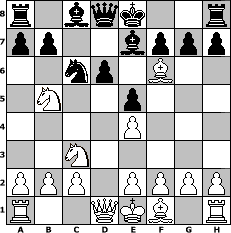 Partie-Notation im PGN-Format [Event "Sweschnikow II"] [Site "www.mySchach.de"] [Date "2012.04.28"] [Round "2"] [White "reisinger"] [Black "muellerh"] [ECO "B33"] [WhitemyELO "1454"] [BlackmyELO "1429"] [Result "1-0"] [TimeControl "10/1728000"] [WhiteDays "20"] [BlackDays "00"] [MySchachNr "81333"] 1. e4 c5 2. Nf3 Nc6 3. d4 cxd4 4. Nxd4 Nf6 5. Nc3 e5 6. Ndb5 d6 7. Bg5 Be7 8. Bxf6 1-0 Stellungs-Notation im FEN-Format r1bqk2r/pp2bppp/2np1B2/1N2p3/4P3/2N5/PPP1PPPP/R2QKB1R - KQkq - 0 8 Geschlagene Figuren Weiss: Geschlagene Figuren Schwarz: Klicken Sie auf eine geschlagene Figur um den gewünschten Zug darzustellen!