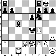Partie-Notation im PGN-Format [Event "9er3"] [Site "www.mySchach.de"] [Date "2013.06.12"] [Round "1"] [White "muellerh"] [Black "Duschgel"] [ECO "A03"] [WhitemyELO "1549"] [BlackmyELO "1617"] [Result "0-1"] [TimeControl "10/3456000"] [WhiteDays "40"] [BlackDays "40"] [MySchachNr "88717"] 1. f4 d5 2. Nf3 c5 3. e3 Nc6 4. c4 dxc4 5. Bxc4 Nf6 6. O-O Bg4 7. h3 Bh5 8. d4 e6 9. Nc3 cxd4 10. exd4 Bxf3 11. Qxf3 Qxd4+ 12. Be3 Qxc4 13. Rac1 Qb4 14. b3 Be7 15. Bd2 Nd4 16. Qe3 Bc5 17. Kh1 Nxb3 18. Qe2 Nxc1 19. Rxc1 O-O 20. Ne4 Qxe4 0-1 Stellungs-Notation im FEN-Format r4rk1/pp3ppp/4pn2/2b5/4qP2/7P/P2BQPP1/2R4K - - - 0 21 Geschlagene Figuren Weiss: Geschlagene Figuren Schwarz: Klicken Sie auf eine geschlagene Figur um den gewünschten Zug darzustellen!