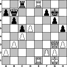 Partie-Notation im PGN-Format [Event "R"] [Site "www.mySchach.de"] [Date "2009.07.20"] [Round "1"] [White "Joschi"] [Black "hape50"] [ECO "B07"] [WhitemyELO "1601"] [BlackmyELO "1379"] [Result "1-0"] [TimeControl "10/864000"] [WhiteDays "36"] [BlackDays "38"] [MySchachNr "57712"] 1. e4 d6 2. d4 e6 3. c4 Nf6 4. Nc3 h6 5. Nf3 Be7 6. Bd3 b6 7. h3 Nbd7 8. Be3 Bb7 9. O-O O-O 10. Re1 c5 11. d5 exd5 12. Nxd5 Nxd5 13. exd5 Nf6 14. Qc2 Bc8 15. Bf5 Bxf5 16. Qxf5 Nd7 17. Re2 Bf6 18. Rae1 Qc7 19. Bf4 Rad8 20. b3 Bc3 21. Bd2 g6 22. Qf4 Bg7 23. Qh4 h5 24. Qg3 Qb8 25. Bg5 Rc8 26. Be7 Rfe8 27. Bxd6 Qa8 28. Ne5 Nxe5 29. Bxe5 Qb7 30. Bxg7 Kxg7 31. Rxe8 1-0 Stellungs-Notation im FEN-Format 2r1R3/pq3pk1/1p4p1/2pP3p/2P5/1P4QP/P4PP1/4R1K1 - - - 0 31 Geschlagene Figuren Weiss: Geschlagene Figuren Schwarz: Klicken Sie auf eine geschlagene Figur um den gewünschten Zug darzustellen!