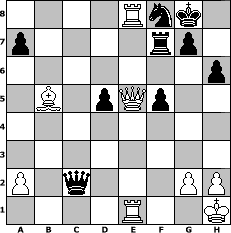 Partie-Notation im PGN-Format [Event ""Freibier f"] [Site "www.mySchach.de"] [Date "2005.05.27"] [Round "1"] [White "Hondo"] [Black "Baehr008"] [ECO "C42"] [WhitemyELO "1930"] [BlackmyELO "1824"] [Result "1-0"] [TimeControl "10/1728000"] [WhiteDays "98"] [BlackDays "98"] [MySchachNr "13643"] 1. e4 e5 2. Nf3 Nf6 3. Nxe5 d6 4. Nf3 Nxe4 5. d3 Nf6 6. d4 d5 7. Bd3 Bd6 8. O-O O-O 9. Bg5 h6 10. Bh4 Be6 11. c3 Nbd7 12. Re1 c6 13. Nbd2 Re8 14. Ne5 Qc7 15. f4 c5 16. Kh1 cxd4 17. cxd4 Qb6 18. f5 Qxd4 19. Ndf3 Qxb2 20. fxe6 Rxe6 21. Re2 Qa3 22. Nxd7 Nxd7 23. Rc2 Nb6 24. Bf2 Rd8 25. Nd4 Ree8 26. Nb5 Qa5 27. Nxd6 Rxd6 28. Bd4 Nd7 29. Qg4 Re1+ 30. Bf1 f6 31. Rc8+ Nf8 32. Qg3 Ree6 33. Rb1 Rd7 34. Qb8 Rf7 35. Bc5 Re8 36. Rxe8 Qxc5 37. Rxb7 Qf2 38. Rb1 Qc5 39. Bd3 f5 40. Qe5 Qc6 41. Bb5 Qc2 42. Re1 1-0 Stellungs-Notation im FEN-Format 4Rnk1/p4rp1/7p/1B1pQp2/8/8/P1q3PP/4R2K - - - 5 42 Geschlagene Figuren Weiss: Geschlagene Figuren Schwarz: Klicken Sie auf eine geschlagene Figur um den gewünschten Zug darzustellen!