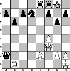 Partie-Notation im PGN-Format [Event "Spa"] [Site "www.mySchach.de"] [Date "2010.05.28"] [Round "1"] [White "Haki"] [Black "hape50"] [ECO "B00"] [WhitemyELO "1215"] [BlackmyELO "1264"] [Result "0-1"] [TimeControl "10/2592000"] [WhiteDays "30"] [BlackDays "30"] [MySchachNr "65811"] 1. e4 b6 2. d4 Bb7 3. Bd3 g6 4. Be3 Bg7 5. Ne2 d5 6. Nbc3 e5 7. exd5 Bxd5 8. Nxd5 Qxd5 9. O-O Ne7 10. Nc3 Qd7 11. dxe5 Bxe5 12. Bd2 O-O 13. Ne4 Nf5 14. f4 Bd4+ 15. Kh1 Bxb2 16. Rb1 Bd4 17. Be3 Nxe3 18. Qf3 Nxf1 19. Bxf1 Qe7 20. c3 Bxc3 21. Nxc3 Nd7 22. Nd5 Qd6 23. Qe3 Qxd5 24. Be2 Rae8 25. Qf3 Qxa2 0-1 Stellungs-Notation im FEN-Format 4rrk1/p1pn1p1p/1p4p1/8/5P2/5Q2/q3B1PP/1R5K - - - 0 26 Geschlagene Figuren Weiss: Geschlagene Figuren Schwarz: Klicken Sie auf eine geschlagene Figur um den gewünschten Zug darzustellen!