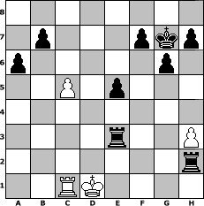 Partie-Notation im PGN-Format [Event "R"] [Site "www.mySchach.de"] [Date "2009.07.20"] [Round "1"] [White "Andreas"] [Black "jeremyt"] [ECO "B27"] [WhitemyELO "1528"] [BlackmyELO "1852"] [Result "0-1"] [TimeControl "10/864000"] [WhiteDays "39"] [BlackDays "39"] [MySchachNr "57700"] 1. e4 c5 2. Nf3 g6 3. d4 Bg7 4. dxc5 Qa5+ 5. c3 Qxc5 6. Be3 Qc7 7. Bd3 Nf6 8. O-O O-O 9. Nbd2 Nc6 10. h3 d5 11. exd5 Nxd5 12. Re1 Nxe3 13. Rxe3 Bh6 14. Re4 Rd8 15. Qe2 Bf5 16. Rd4 Nxd4 17. Nxd4 Bxd3 18. Qxd3 Bxd2 19. Qxd2 e5 20. Nb5 Rxd2 21. Nxc7 Rc8 22. Nb5 a6 23. Na3 Rxb2 24. c4 Kg7 25. Kf1 Rd8 26. c5 Rdd2 27. Nc4 Rxf2+ 28. Kg1 Rxg2+ 29. Kf1 Rbf2+ 30. Ke1 Rh2 31. Rc1 Rxa2 32. Ne3 Rae2+ 33. Kd1 Rxe3 0-1 Stellungs-Notation im FEN-Format 8/1p3pkp/p5p1/2P1p3/8/4r2P/7r/2RK4 - - - 0 34 Geschlagene Figuren Weiss: Geschlagene Figuren Schwarz: Klicken Sie auf eine geschlagene Figur um den gewünschten Zug darzustellen!
