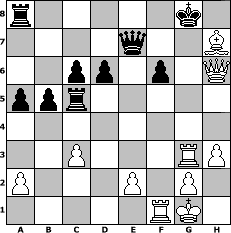 Partie-Notation im PGN-Format [Event "3. Norderstedter DENK MAL Open 2012"] [Site "www.mySchach.de"] [Date "2012.02.08"] [Round "1"] [White "Steppenwolf"] [Black "Knight"] [ECO "C54"] [WhitemyELO "1060"] [BlackmyELO "1260"] [Result "1-0"] [TimeControl "10/2592000"] [WhiteDays "26"] [BlackDays "30"] [MySchachNr "79797"] 1. e4 e5 2. Nf3 Nc6 3. Bc4 Bc5 4. c3 Nf6 5. d3 d6 6. Bg5 O-O 7. d4 exd4 8. cxd4 Bb4+ 9. Nc3 Bg4 10. h3 Bxf3 11. Qxf3 Re8 12. O-O Nxd4 13. Qg3 Bxc3 14. bxc3 Nc6 15. Rad1 Ne5 16. Bd5 c6 17. Bb3 b5 18. Qh4 Ng6 19. Bxf6 gxf6 20. f4 a5 21. Qh6 Rxe4 22. Bc2 Rc4 23. f5 Nf8 24. Rd3 Ng6 25. fxg6 fxg6 26. Rg3 Rc5 27. Bxg6 Qe7 28. Bxh7+ 1-0 Stellungs-Notation im FEN-Format r5k1/4q2B/2pp1p1Q/ppr5/8/2P3RP/P3P1P1/5RK1 - - - 0 28 Geschlagene Figuren Weiss: Geschlagene Figuren Schwarz: Klicken Sie auf eine geschlagene Figur um den gewünschten Zug darzustellen!